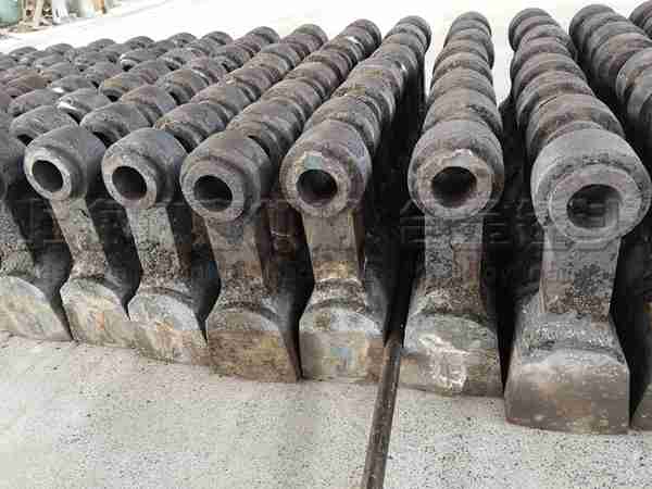 二、設(shè)計結(jié)構(gòu)的改進(jìn):由于高鉻合金的脆性,需要對錘頭的結(jié)構(gòu)進(jìn)行改進(jìn):① 將可能引起錘頭應(yīng)力集中的方形螺栓孔改為圓形或橢圓形螺栓孔,以減少錘頭在使用中的開裂現(xiàn)象;② 破碎機(jī)錘頭廠家將較長的錘頭從安裝孔中間斷開,并在不影響破碎效果的前提下預(yù)留安裝間隙,以減小彎矩,降低錘頭安裝面的尺寸和形狀要求,并使錘頭結(jié)構(gòu)在轉(zhuǎn)子安裝過程中更加穩(wěn)定。